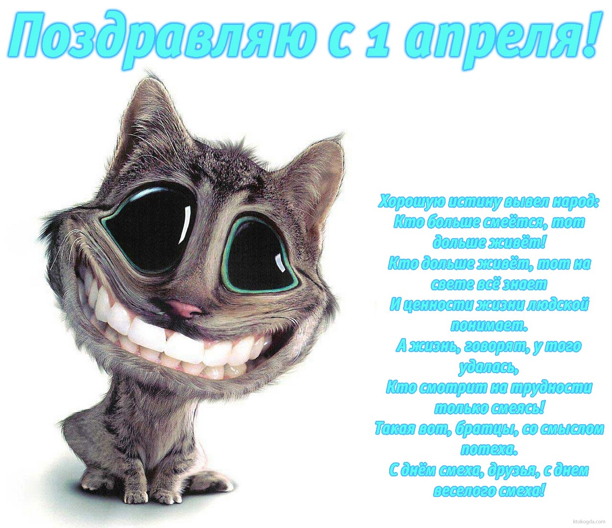 Открытка Поздравляю с 1 апреля с стихотворением, улыбающийся кот