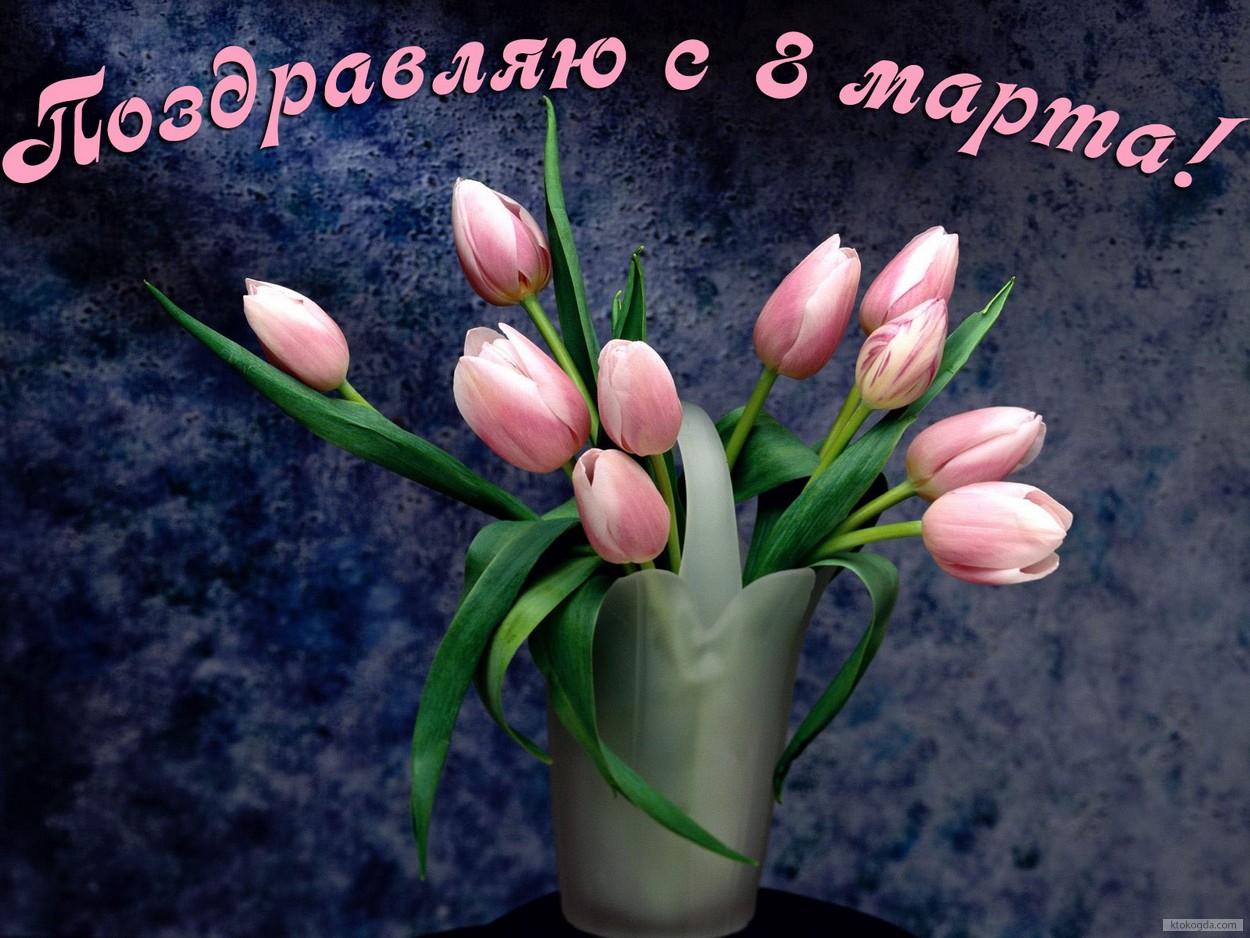 Открытка поздравляю с 8 марта, букет из тюльпанов