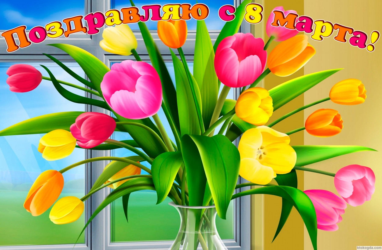 Открытка поздравляю с 8 марта, букет тюльпанов