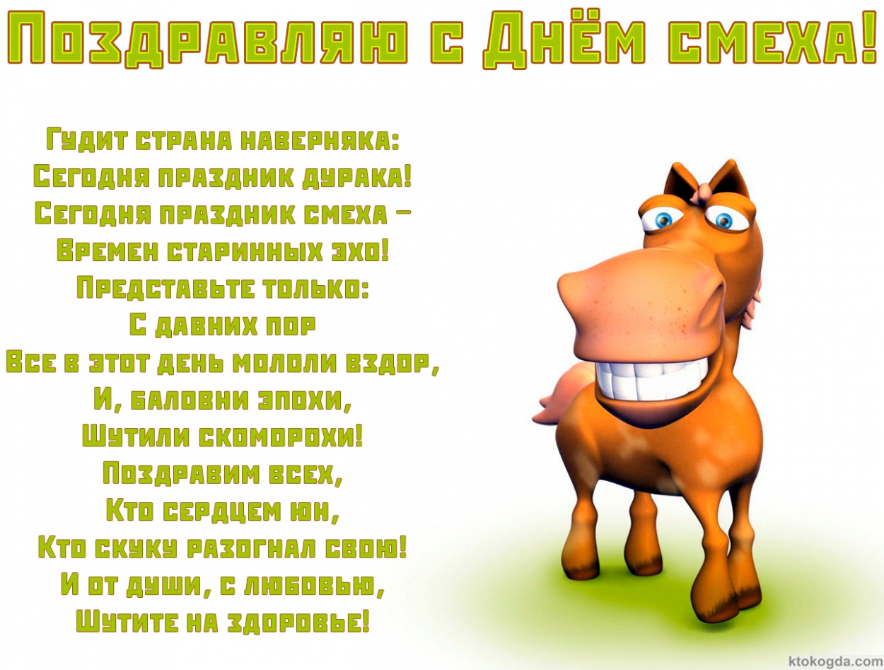 Открытка Поздравляю с Днем смеха с стихотворением, улыбающаяся лошадь, Поздравим всех, кто сердцем юн, кто скуку разогнал свою! И от души, с любовью, шутите на здоровье!