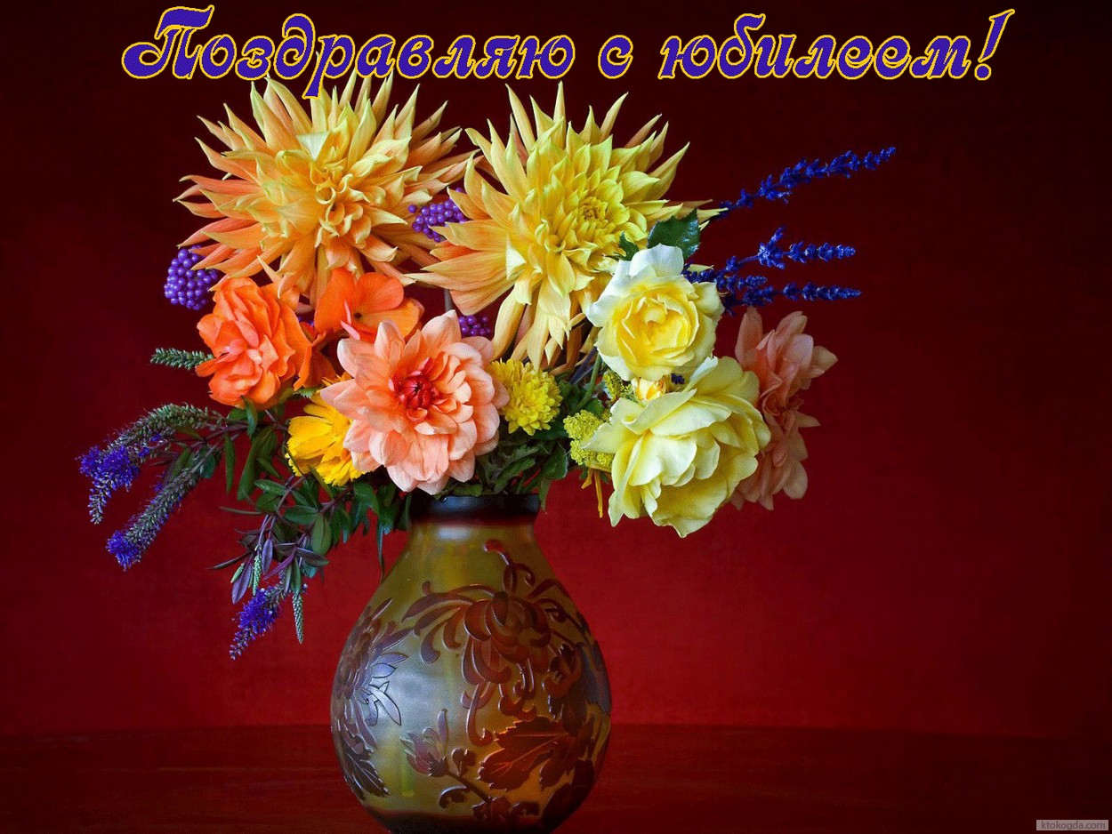Открытка Поздравляю с юбилеем, букет цветов в вазе