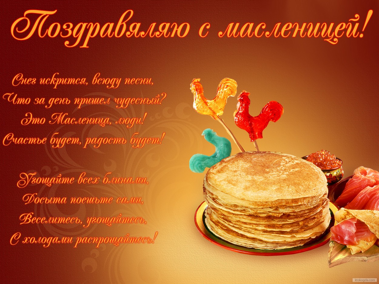 Открытка Поздравляю с масленицей с стихотворением-пожеланием, блины