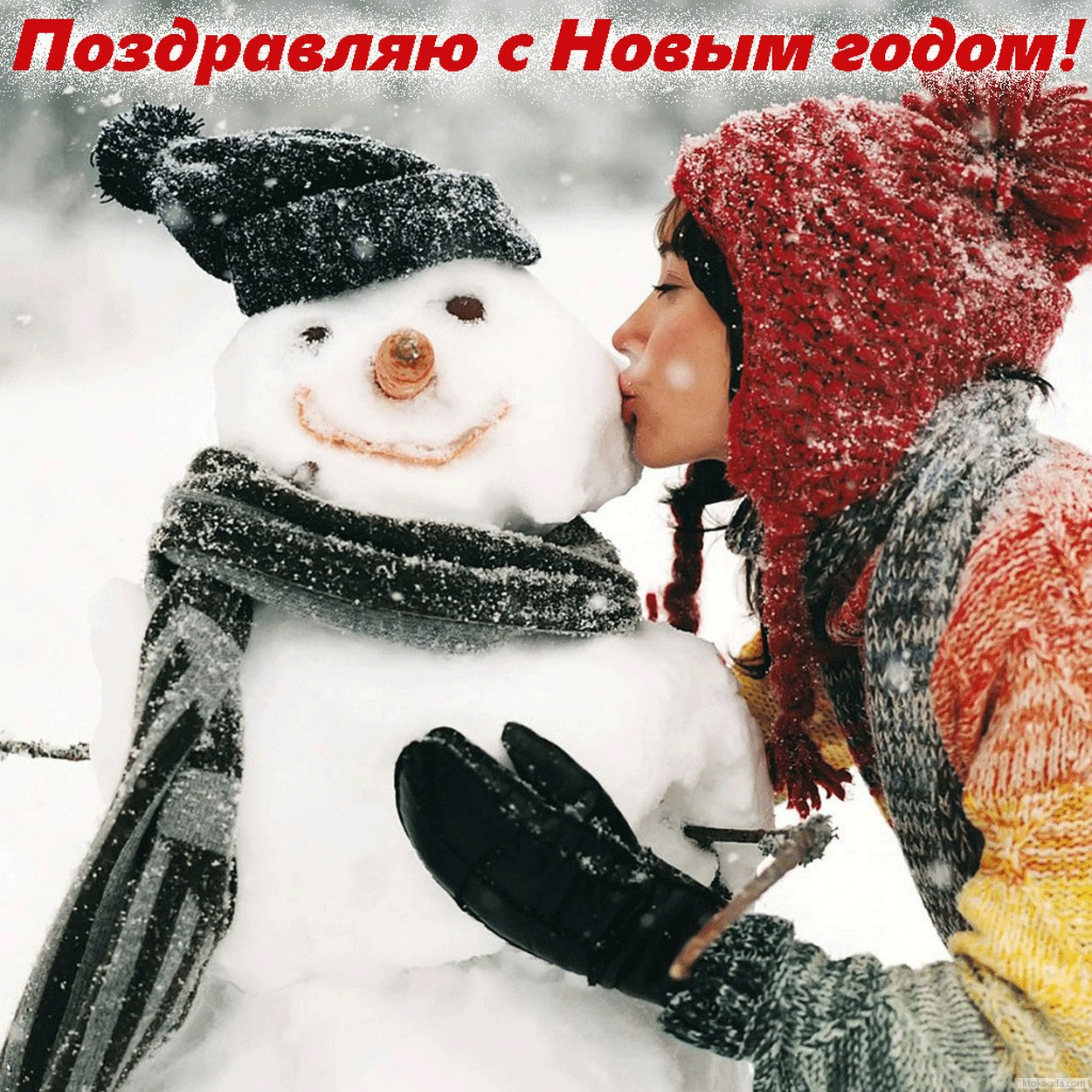 Открытка Поздравляю с Новым годом, девушка и снеговик