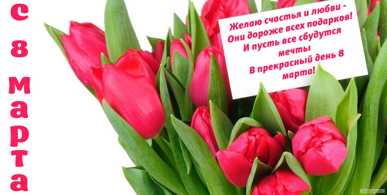 Открытка с 8 марта с стихотворением-пожеланием, букет тюльпанов
