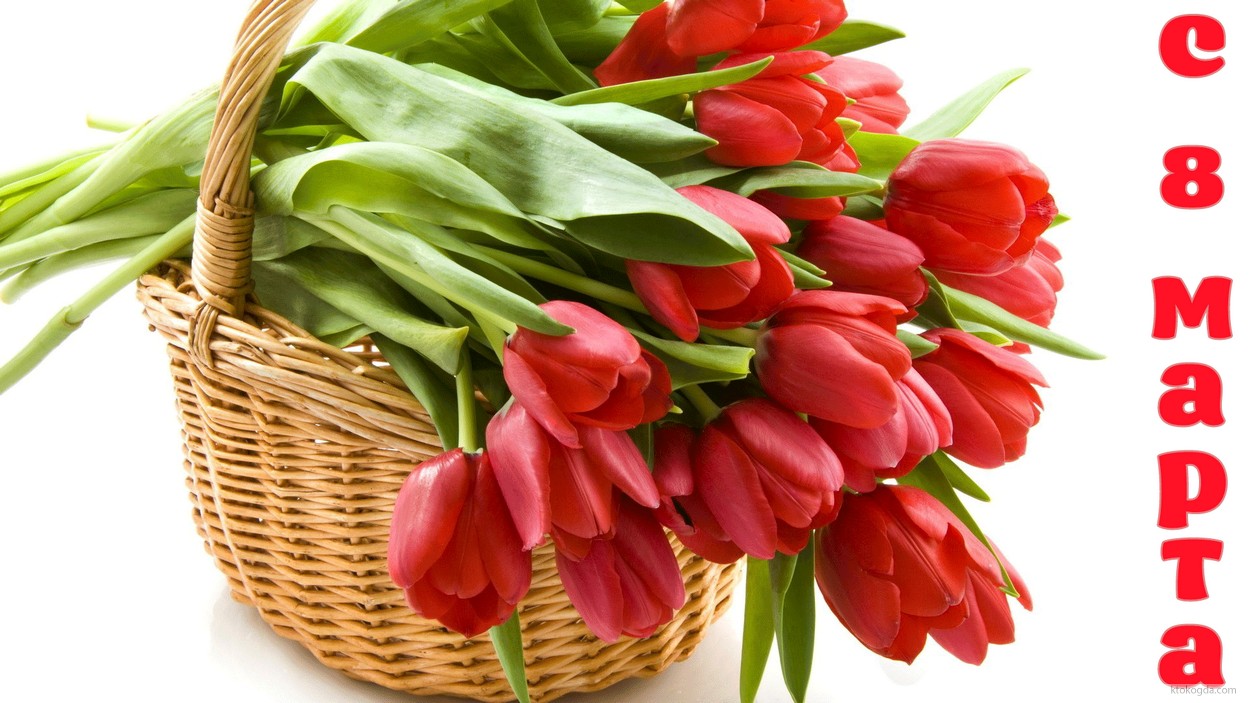 Открытка с 8 марта, тюльпаны в корзине
