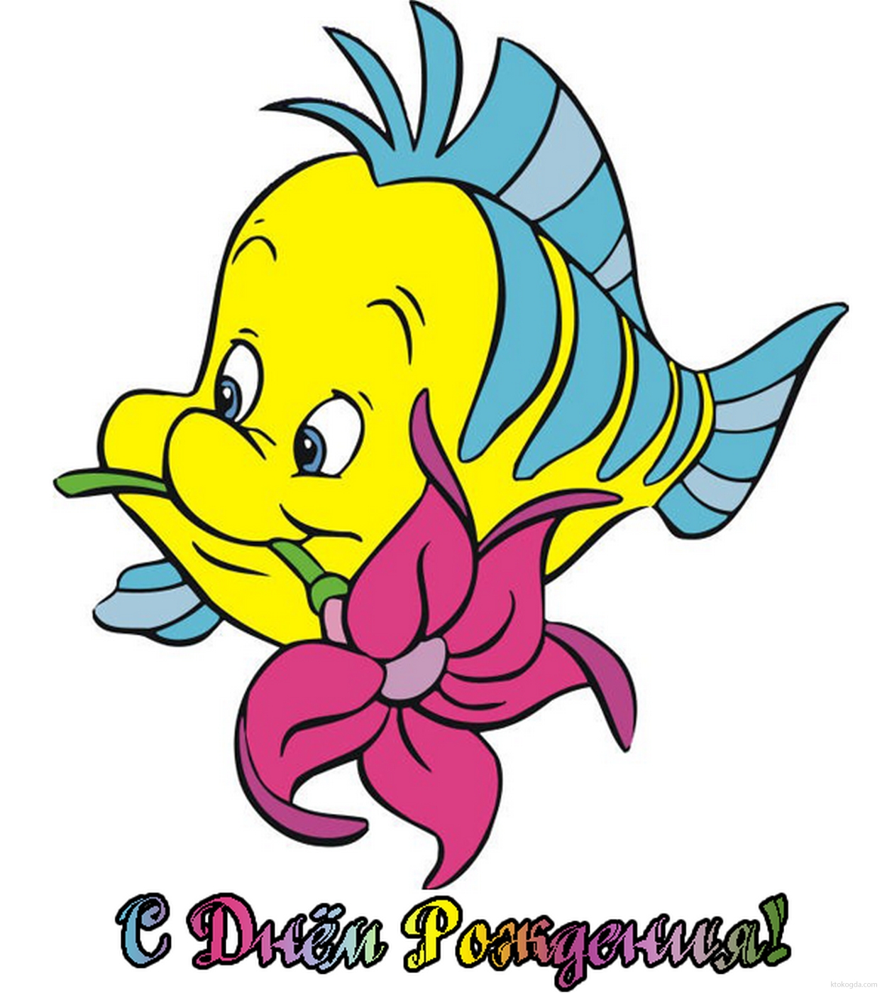 Открытка с Днем Рождения для ребенка, герои мультфильмов, рыбка Флаундер и цветок