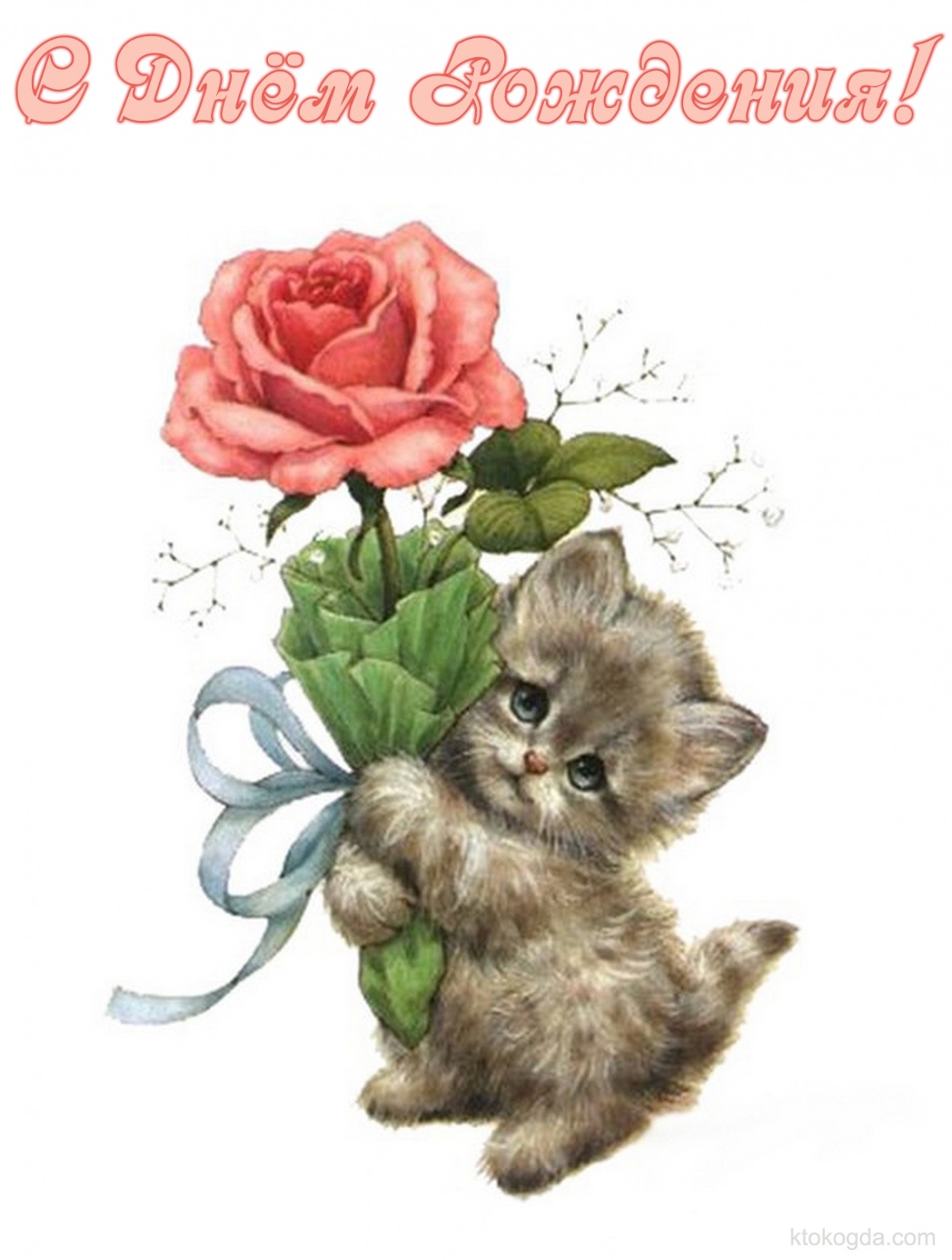 Открытка с Днем Рождения, котенок и цветок