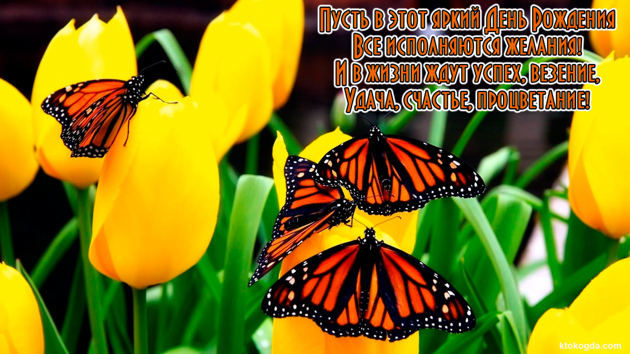 Открытка с Днем Рождения с стихотворением, цветы, желтые тюльпаны и бабочки