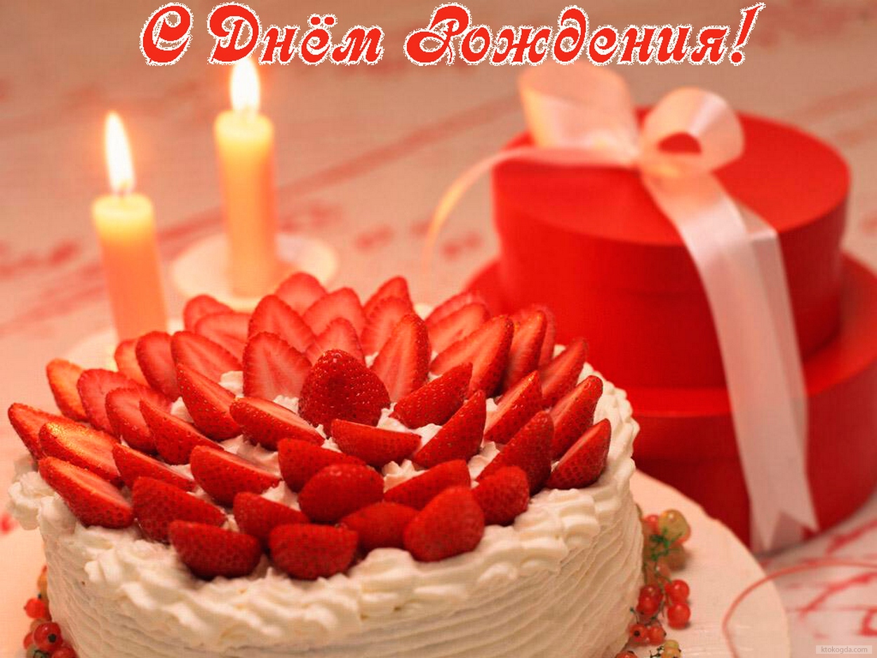 Открытка с Днем Рождения, торт с клубникой, подарок и свечи