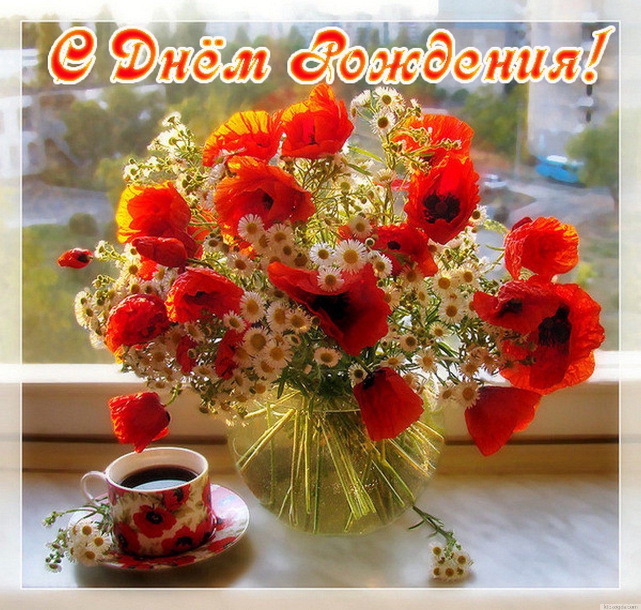 Открытка с Днем Рождения, цветы, букет из маков и ромашек
