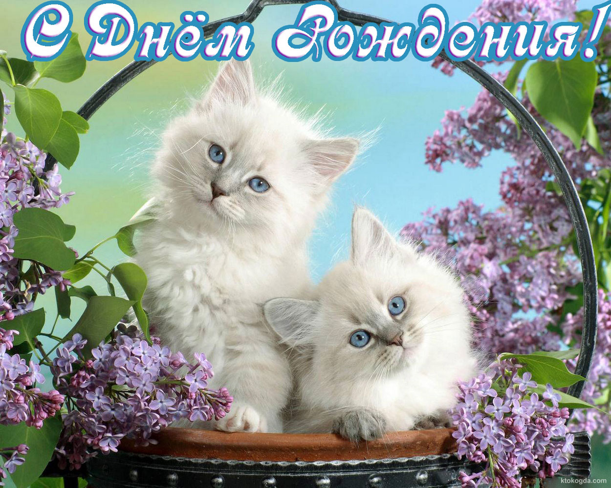 Открытка с Днем Рождения, цветы, котята и сирень