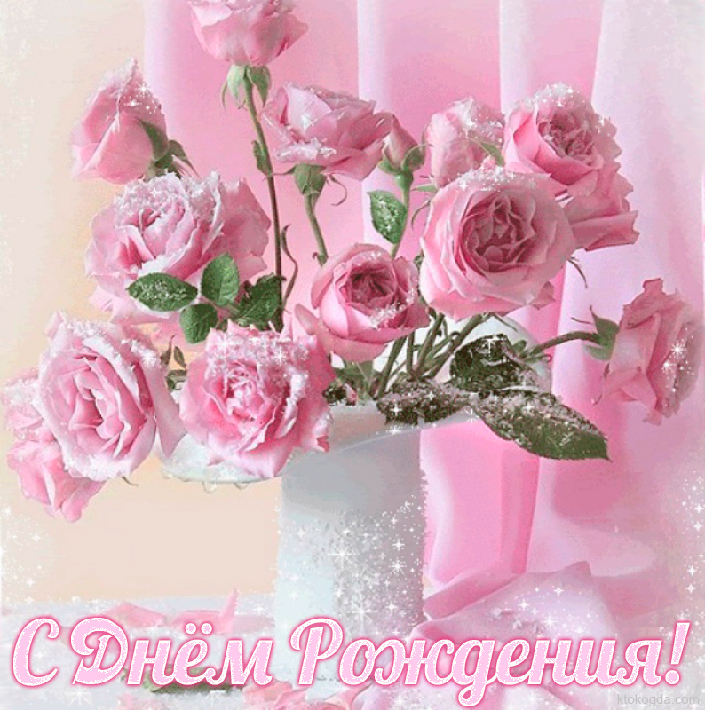 Открытка с Днем Рождения, цветы, розовые розы в вазе