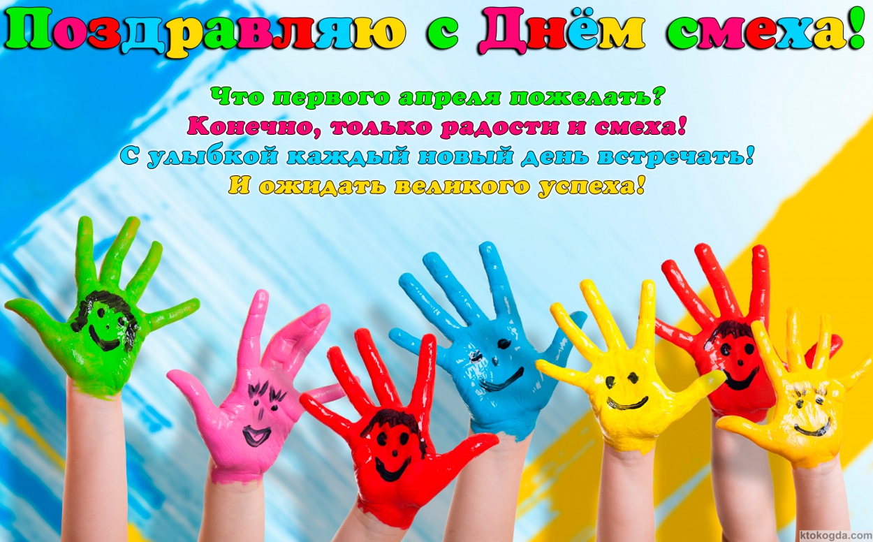 Открытка с Днем смеха с пожеланием, Что 1 апреля пожелать? Конечно, только радости и смеха! С улыбкой каждый новый день встречать! И ожидать великого успеха!