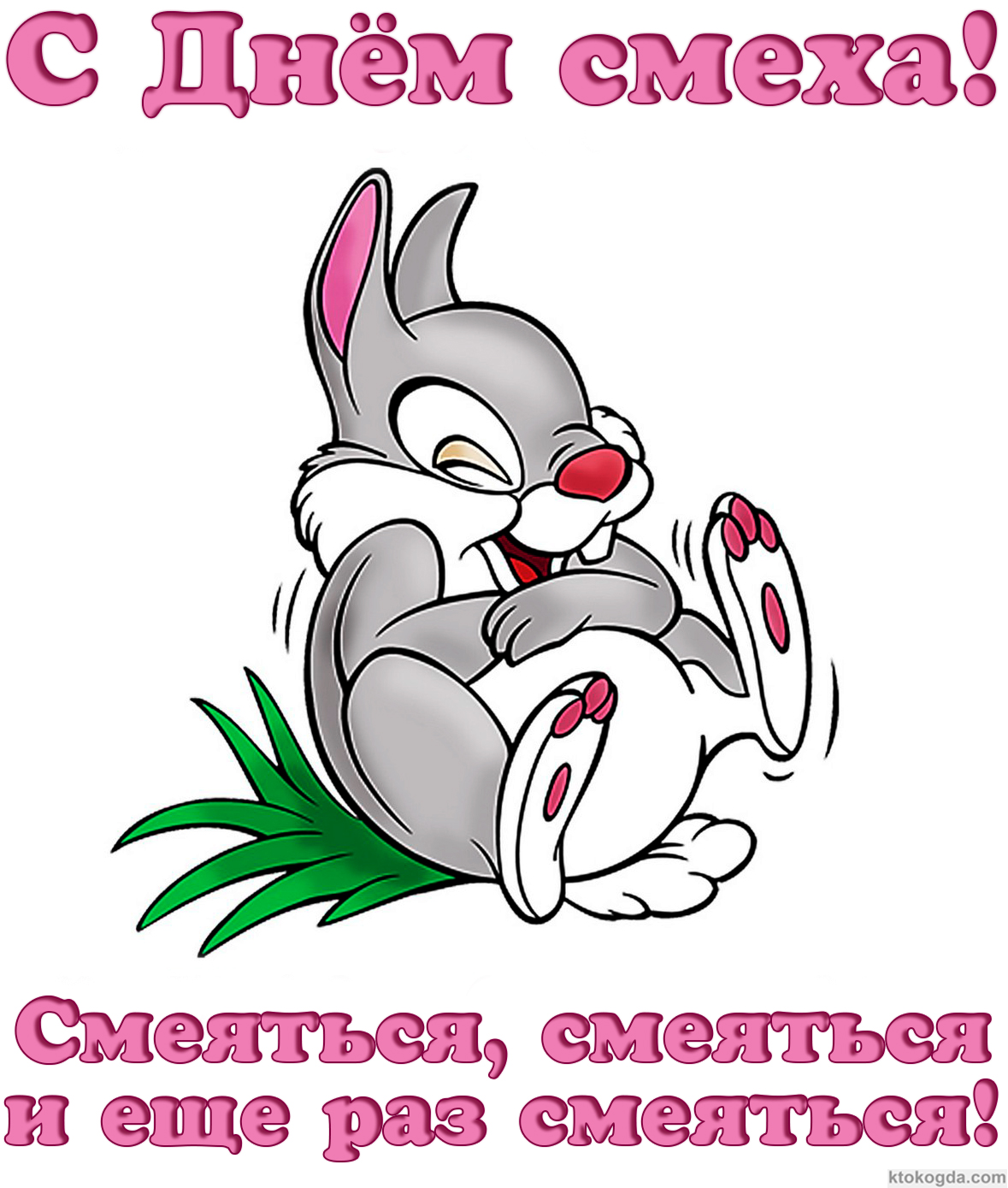 Открытка с Днем смеха с пожеланием смеяться, смеющийся заяц