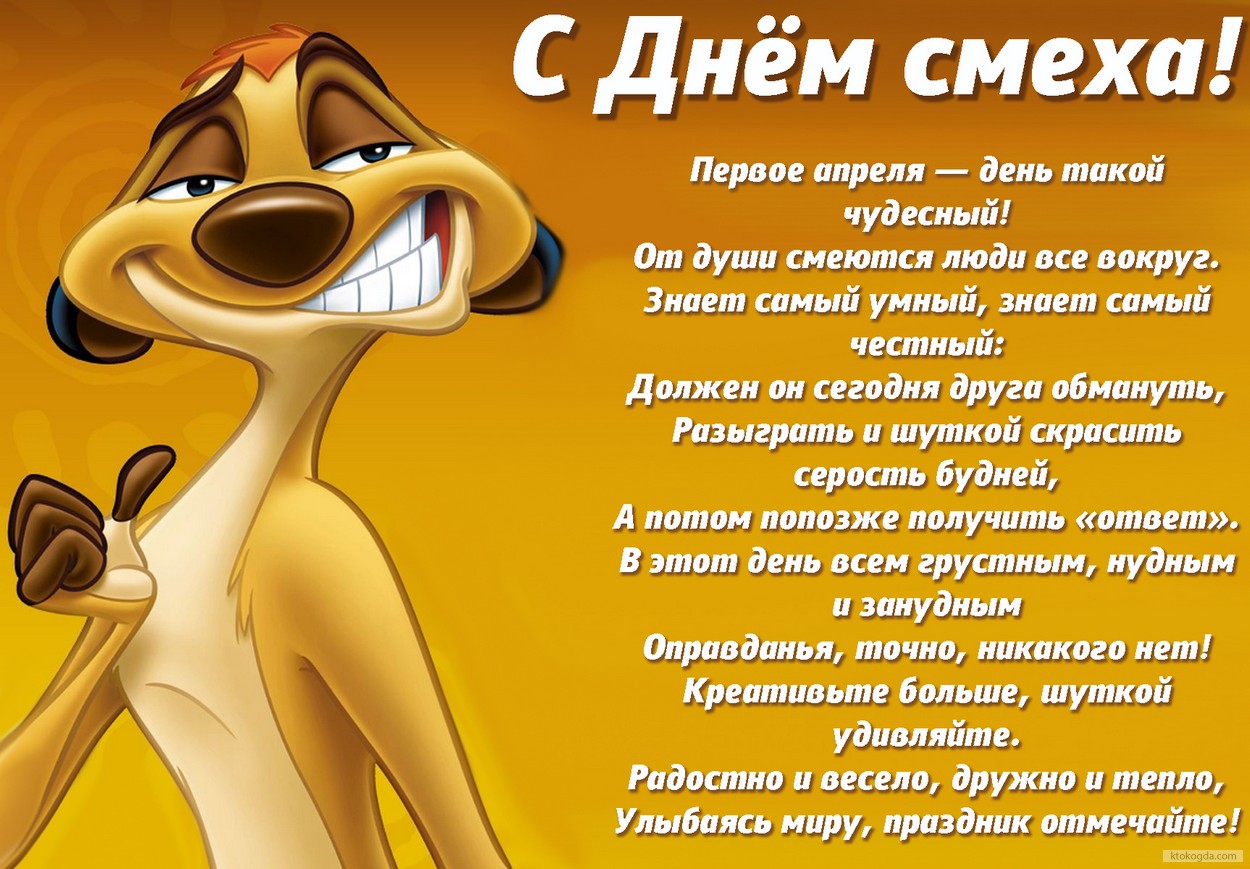 Открытка с Днем смеха с стихотворением, герои мультфильмов, Тимон