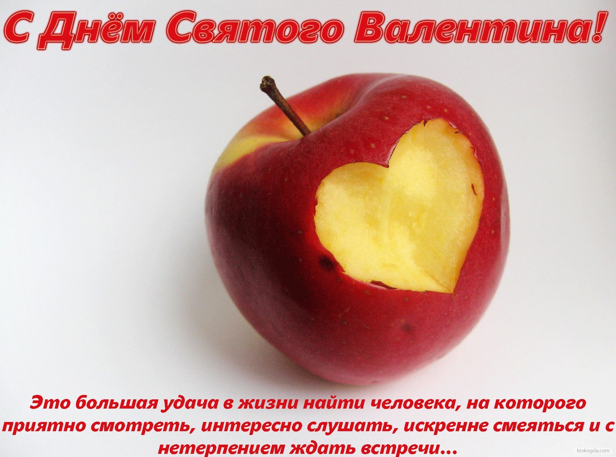 Открытка с Днем Святого Валентина с стихотворением, яблоко с сердечком