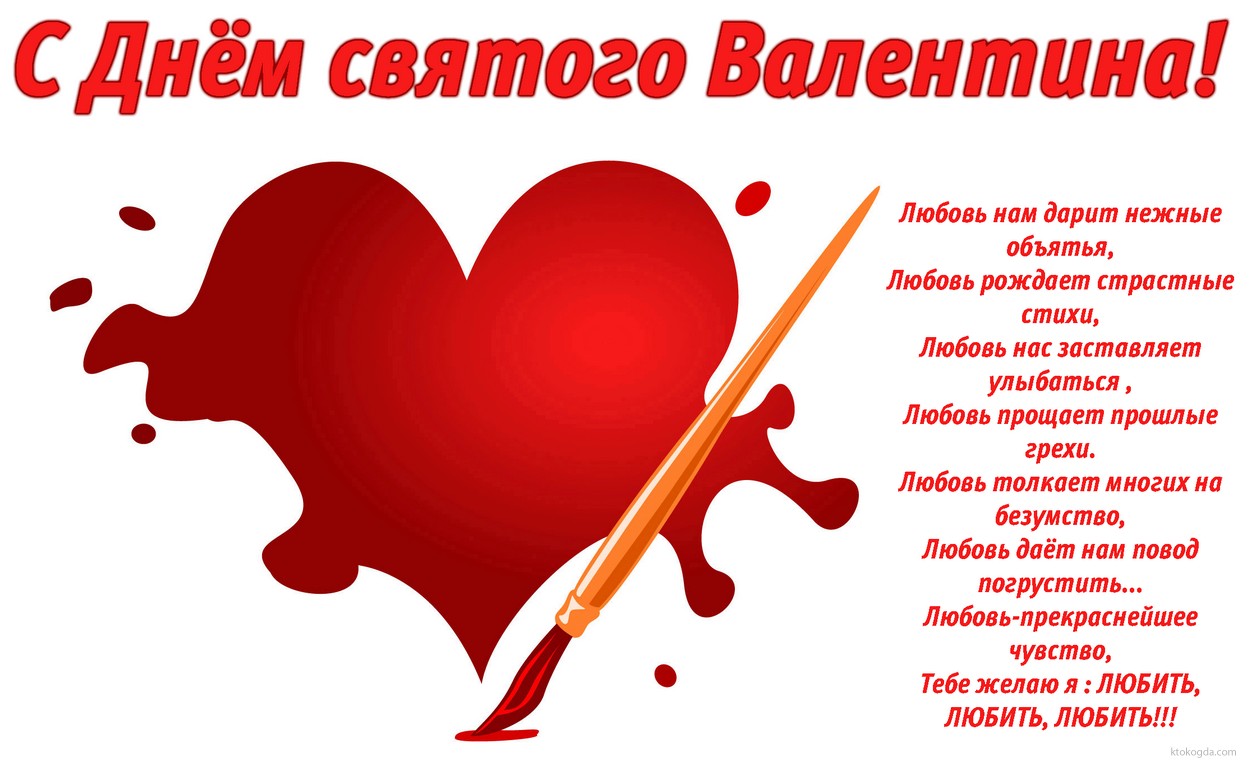 Открытка с Днем Святого Валентина с стихотворением, сердечко и кисть