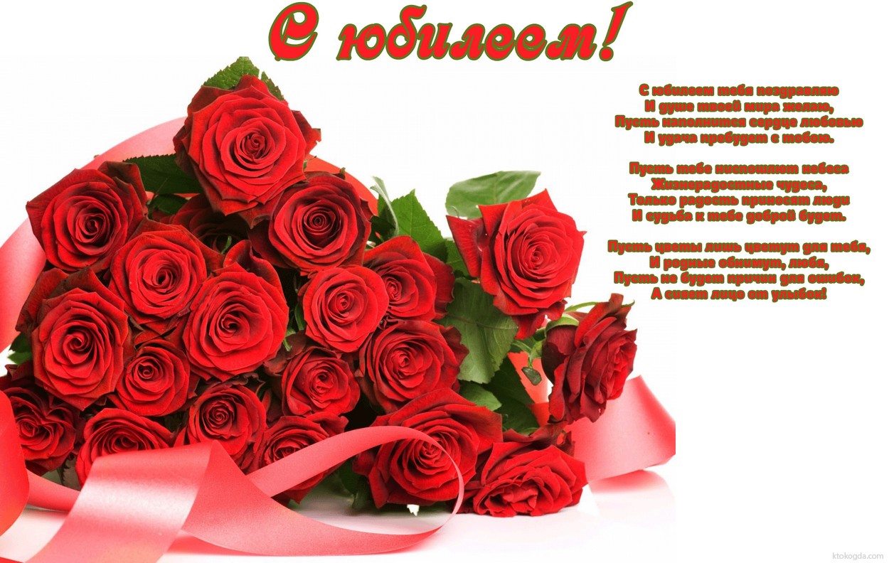 Открытка с юбилеем с пожеланиями, цветы, большой букет из красных роз, стихи