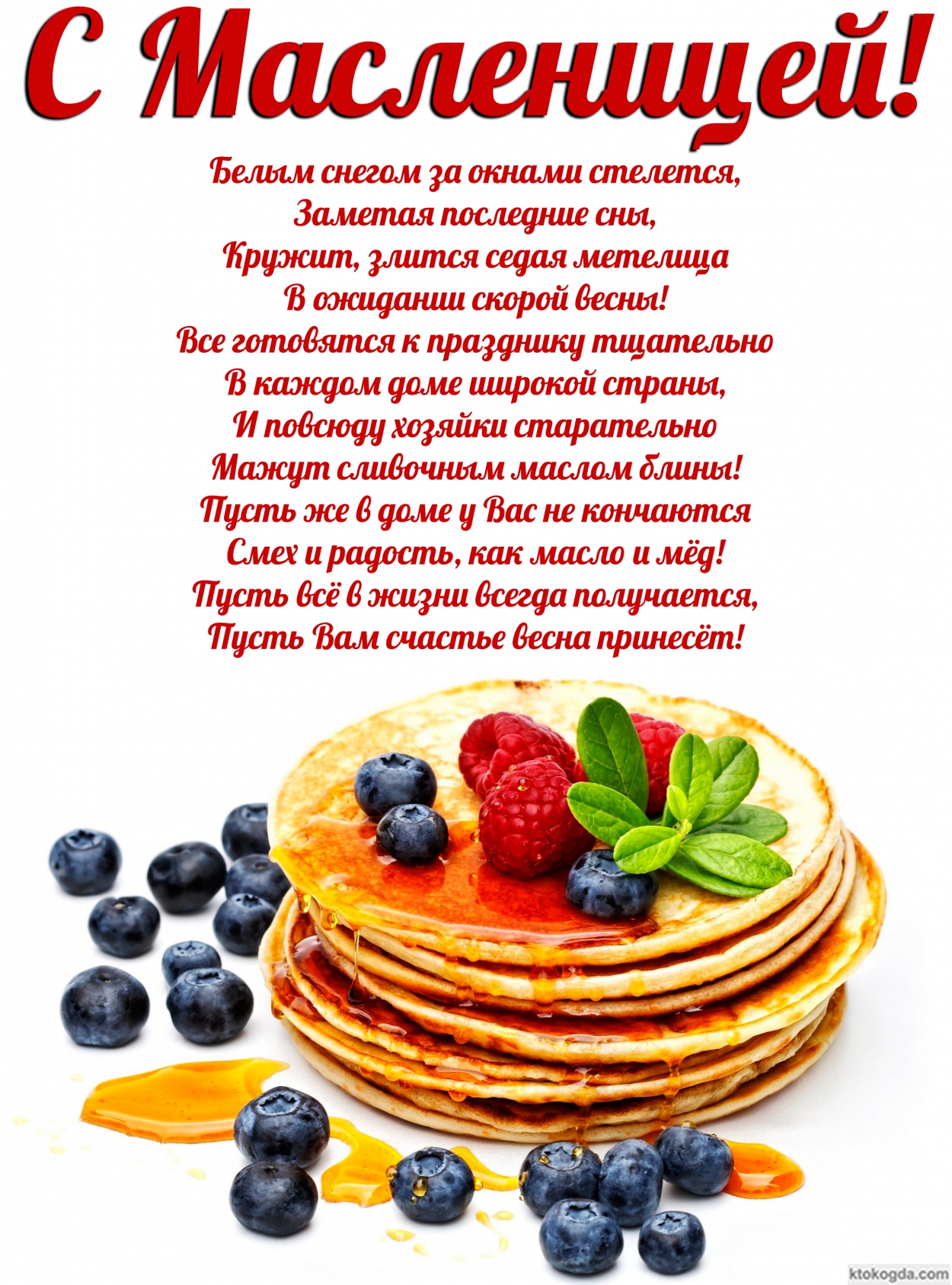 Открытка с масленицей с стихотворением-пожеланием, блины с ягодами
