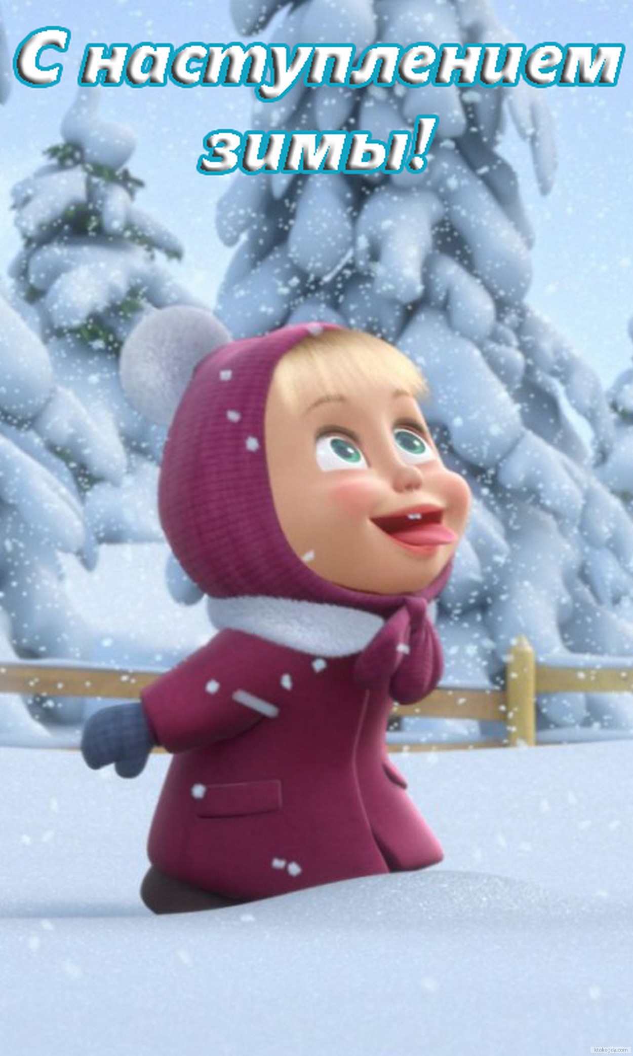 Открытка с наступлением зимы, герои мультфильмов, Маша и снежинки