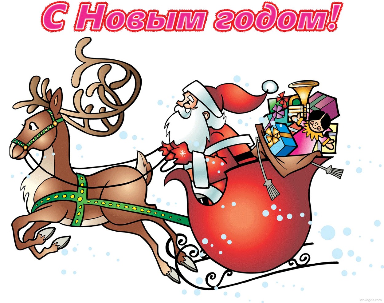 Открытка с Новым годом, Дед Мороз-Санта Клаус и олени, подарки