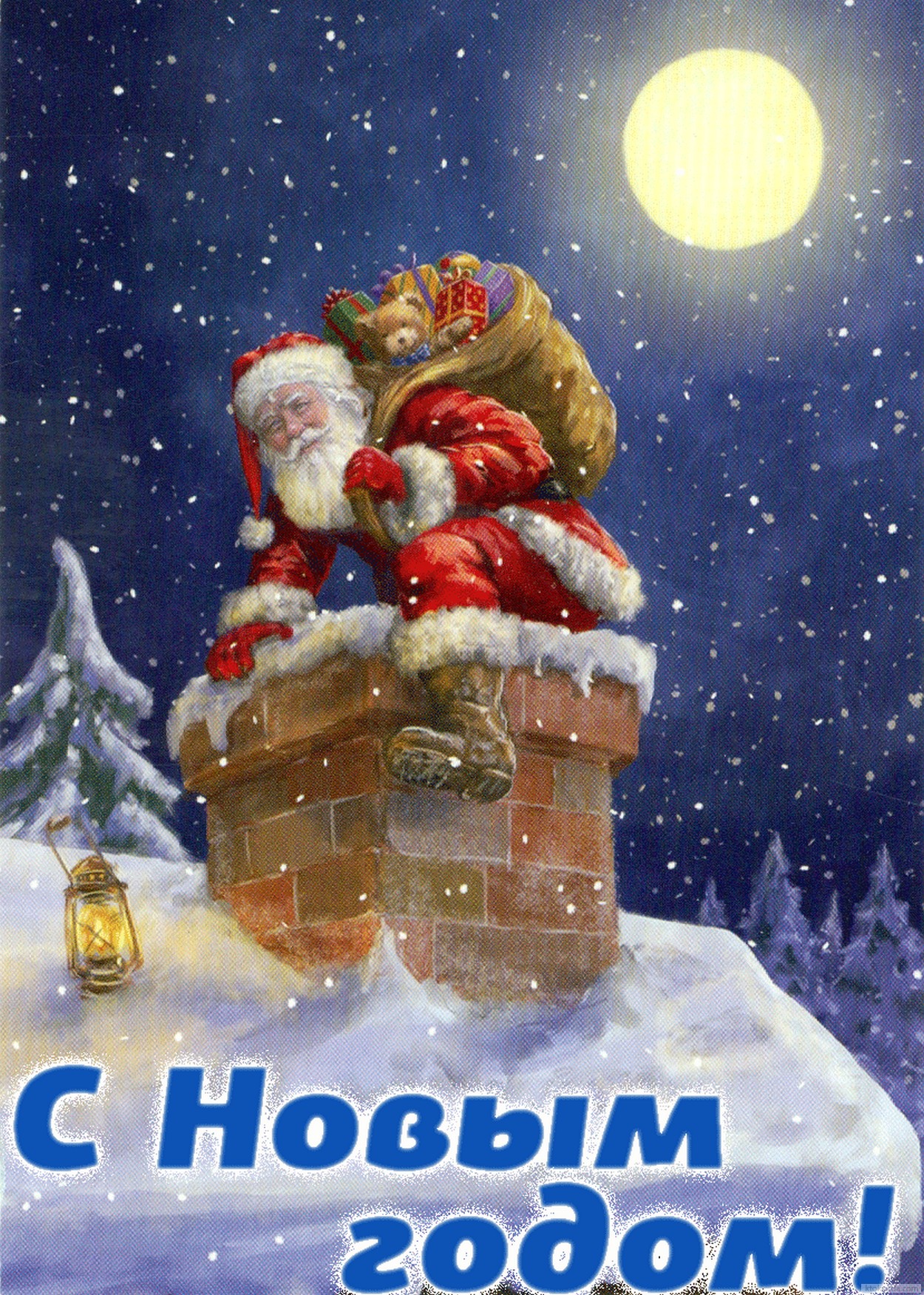 Открытка с Новым годом, Дед Мороз-Санта Клаус с подарками залезает в каминную трубу