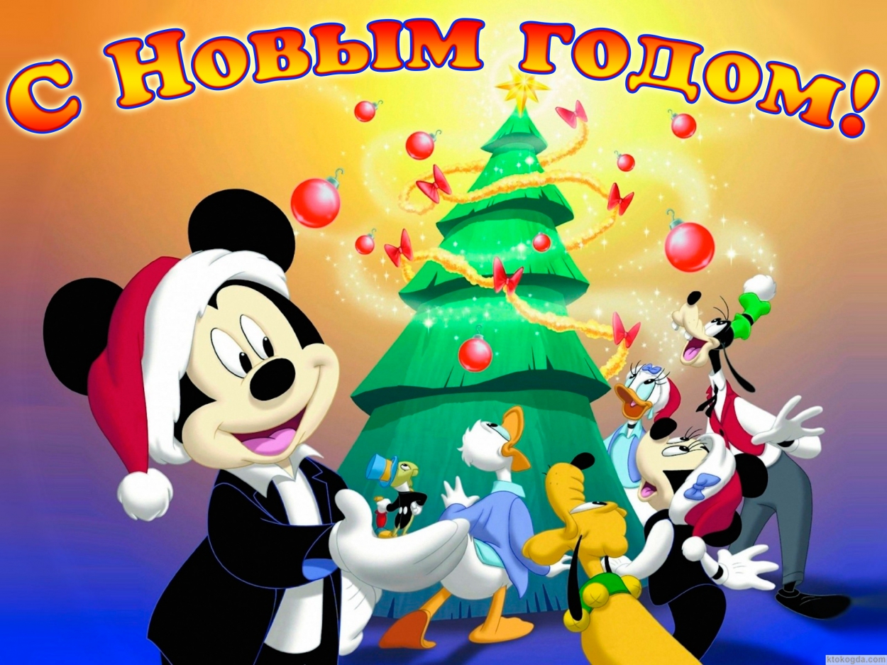 Открытка с Новым годом, герои мультфильмов, Микки Маус и новогодняя елка