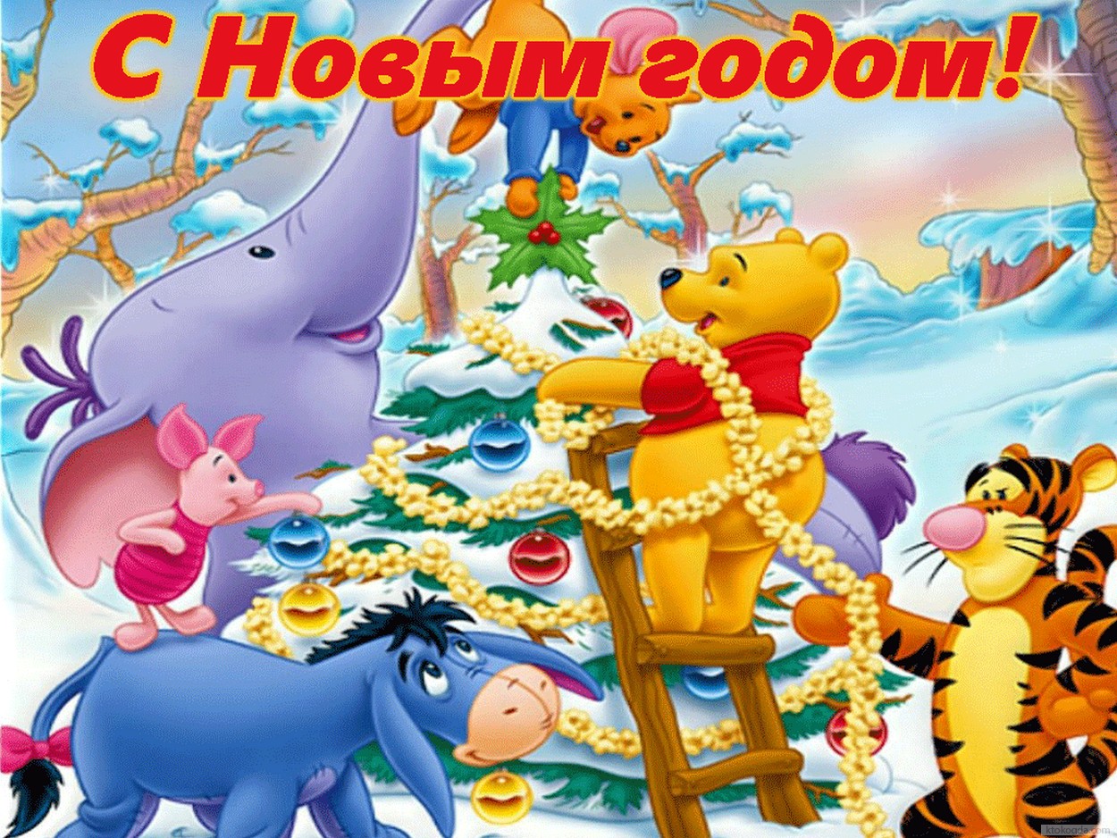 Открытка с Новым годом, герои мультфильмов, Винни Пух и новогодняя елка