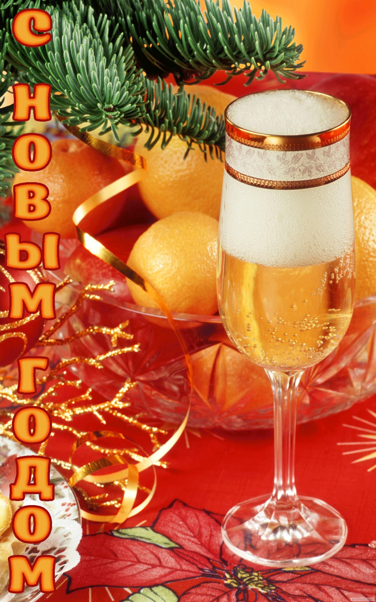 Открытка с Новым годом, мандарины, шампанское, елка
