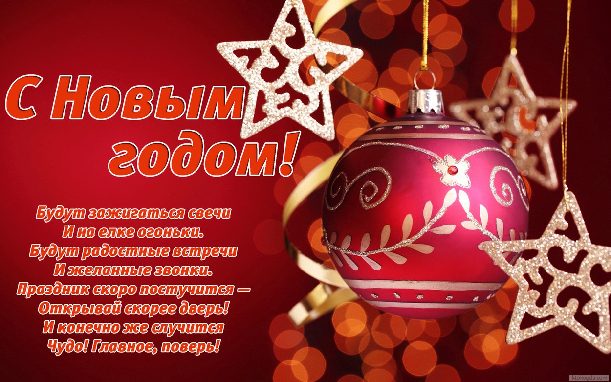 Открытка с Новым годом с поздравлением, елочная игрушка, стихи