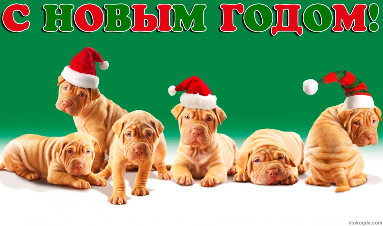 Открытка с Новым годом, животные, щенки-шарпеи в новогодних шапках Деда Мороза/Санта Клауса