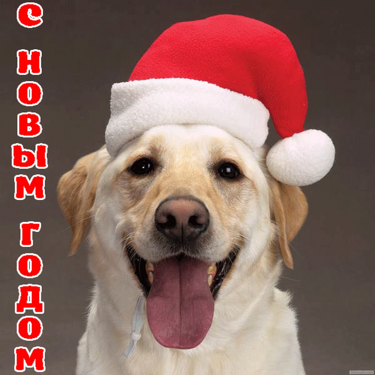 Открытка с Новым годом, животные, собака в новогодней шапке Деда Мороза/Санта Клауса