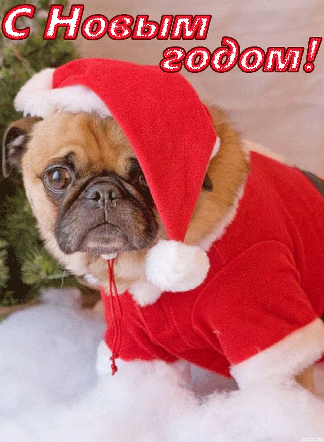 Открытка с Новым годом, животные, собака в новогоднем костюме Деда Мороза-Санта Клауса