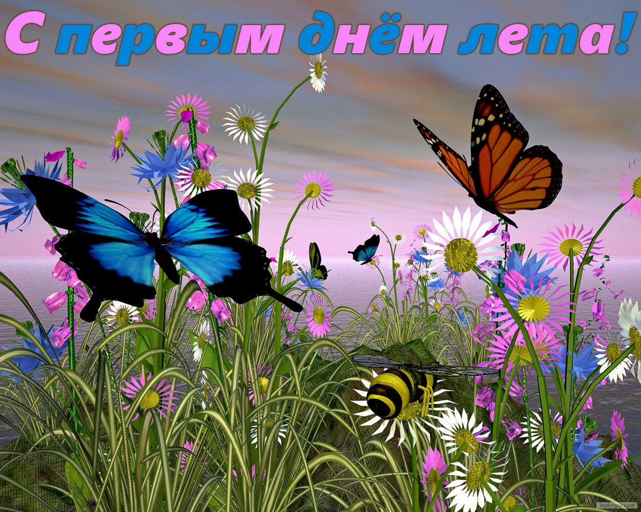 Открытка с первым днем лета, бабочки и цветы