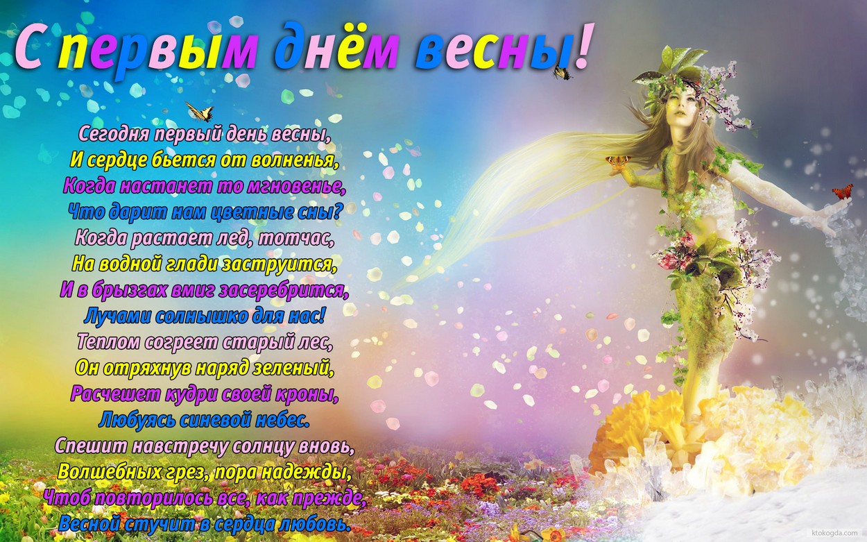 Открытка с первым днем весны с стихотворением-пожеланием