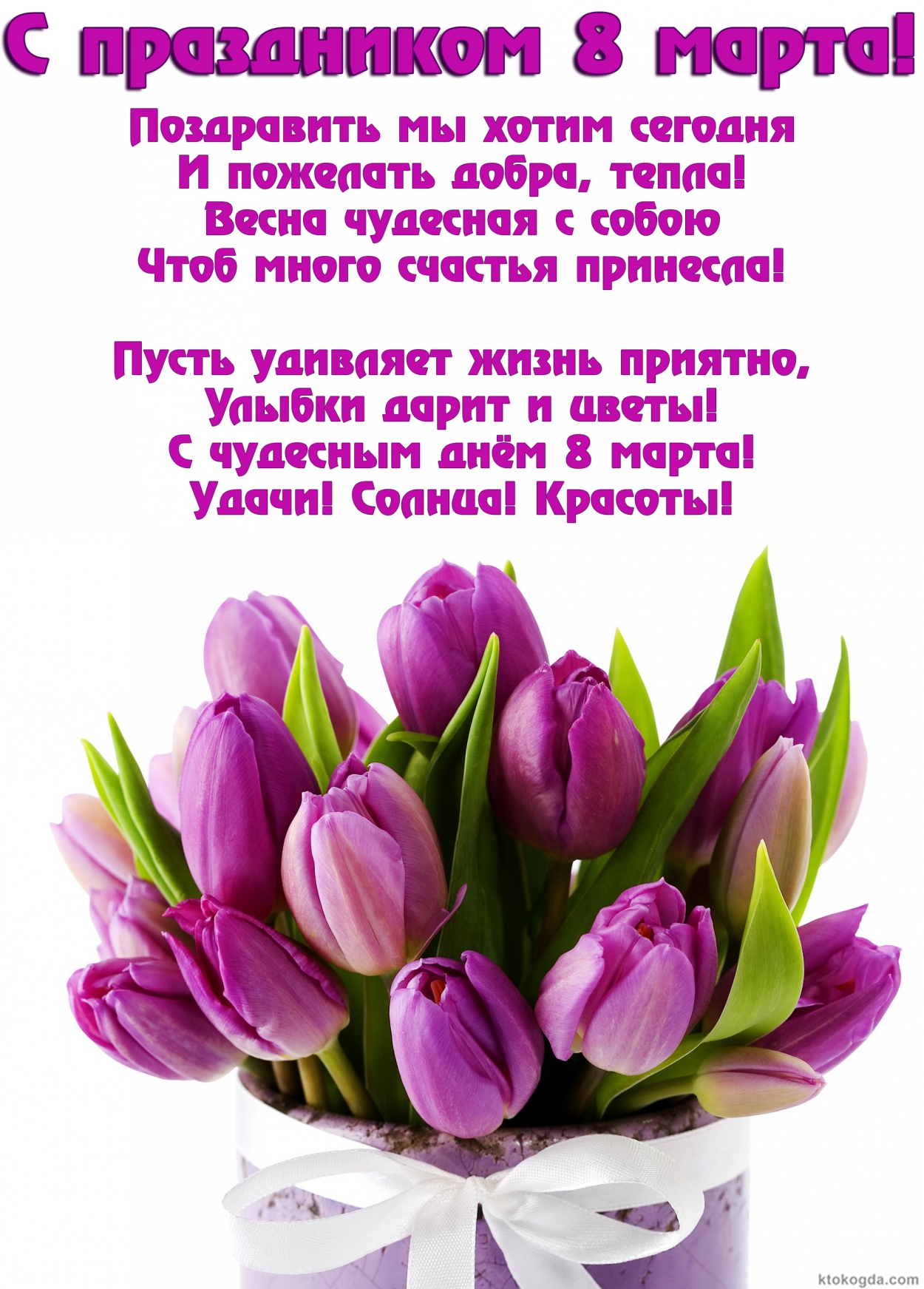 Открытка с праздником 8 марта, Поздравить радостно сегодня И пожелать добра, тепла, Весна чудесная с собою Чтоб много счастья принесла! Пусть удивляет жизнь приятно, Улыбки дарит и цветы! С чудесным днём 8 марта! Удачи! Солнца! Красоты!