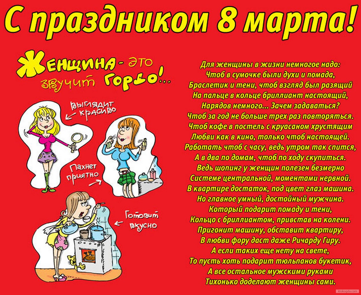 Открытка с праздником 8 марта с стихотворением-пожеланием, прикольная