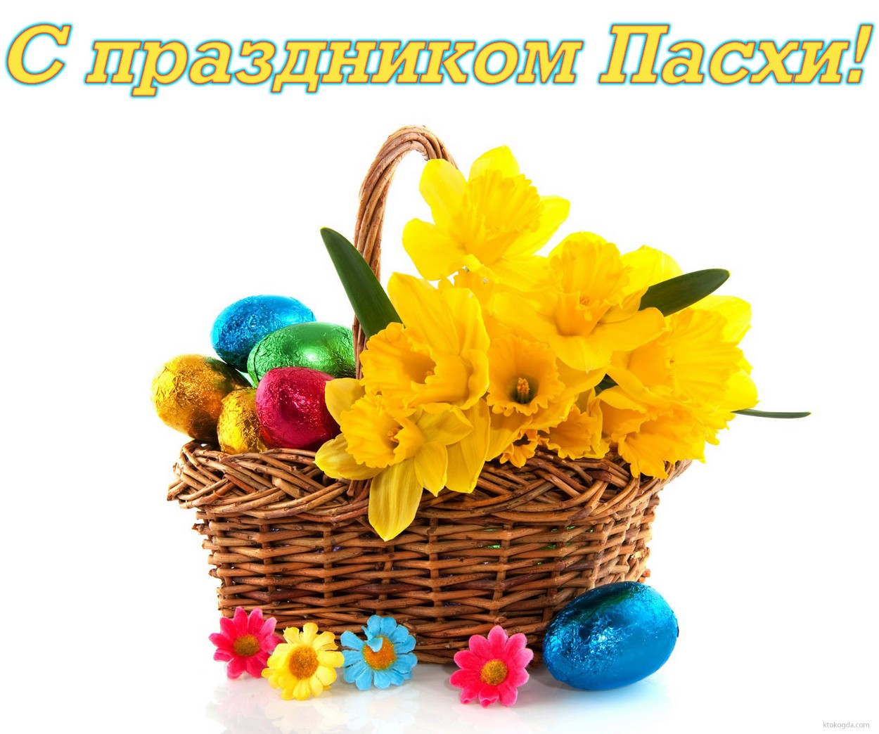 Открытка с праздником Пасхи, пасхальные яйца и цветы в корзине