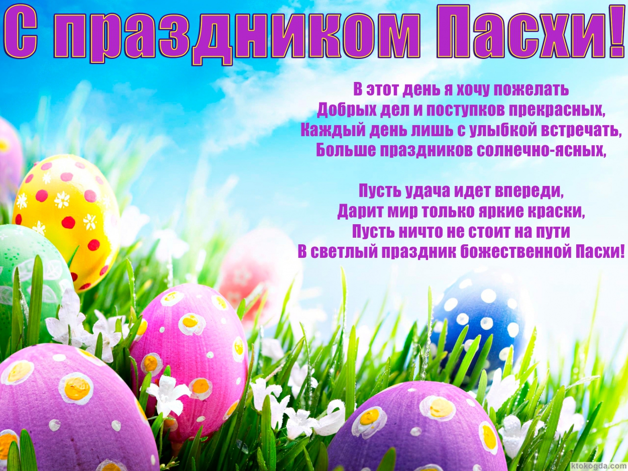 Открытка с праздником Пасхи, В этот день я хочу пожелать Добрых дел и поступков прекрасных, Каждый день лишь с улыбкой встречать, Больше праздников солнечно-ясных!