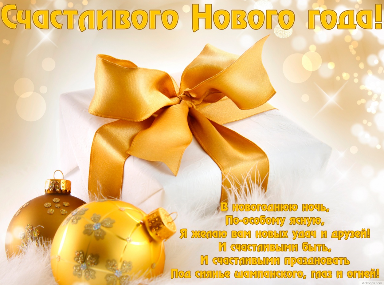 Открытка счастливого нового года, В новогоднюю ночь, По-особому ясную, Я желаю вам новых удач и друзей! И счастливыми быть, И счастливыми праздновать Под сиянье шампанского, глаз и огней!